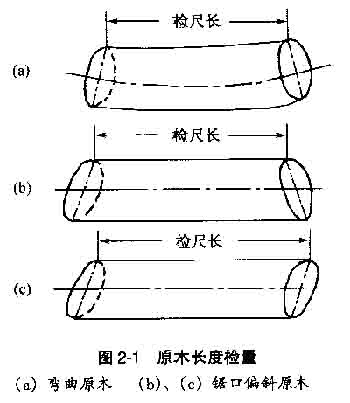 。1)長(zhǎng)度檢量 、贆z量方法:長(zhǎng)度檢量是在原木小頭斷面至大頭斷面之間相距最短處取直檢量。檢量時(shí),量至厘米,不足厘米者四舍五入取整。 檢量彎曲原木、鋸口偏斜原木的長(zhǎng)度時(shí),均是量取兩頭斷面間的最小距離(圖2-l)。