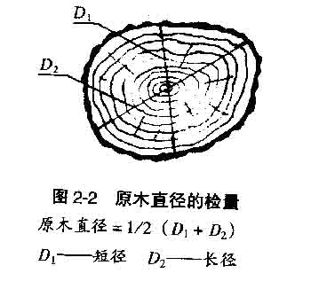 注:按前蘇聯(lián)標(biāo)準(zhǔn)和現(xiàn)行價(jià)格,長(zhǎng)材比短材價(jià)格高10%,短材比規(guī)格材價(jià)格高10%。長(zhǎng)、短材中,非標(biāo)準(zhǔn)材價(jià)格又略高。 。2)直徑檢量 、贆z量方法:直徑檢量以原木小頭斷面的最大直徑和最小直徑的平均值計(jì),經(jīng)進(jìn)舍后為原木檢尺徑。 檢量原木直徑時(shí),應(yīng)注意:一是要在小頭斷面;二是要去掉皮厚(長(zhǎng)薪材除外);三是長(zhǎng)徑、短徑不需要垂直交叉;四是不需要區(qū)分長(zhǎng)徑、短徑的檢量先后順序;五是不論長(zhǎng)徑、短徑均需通過斷面幾何中心進(jìn)行檢量;六是檢量時(shí)量至毫米,不足毫米者舍去。原木直徑的檢量見圖2-2。
